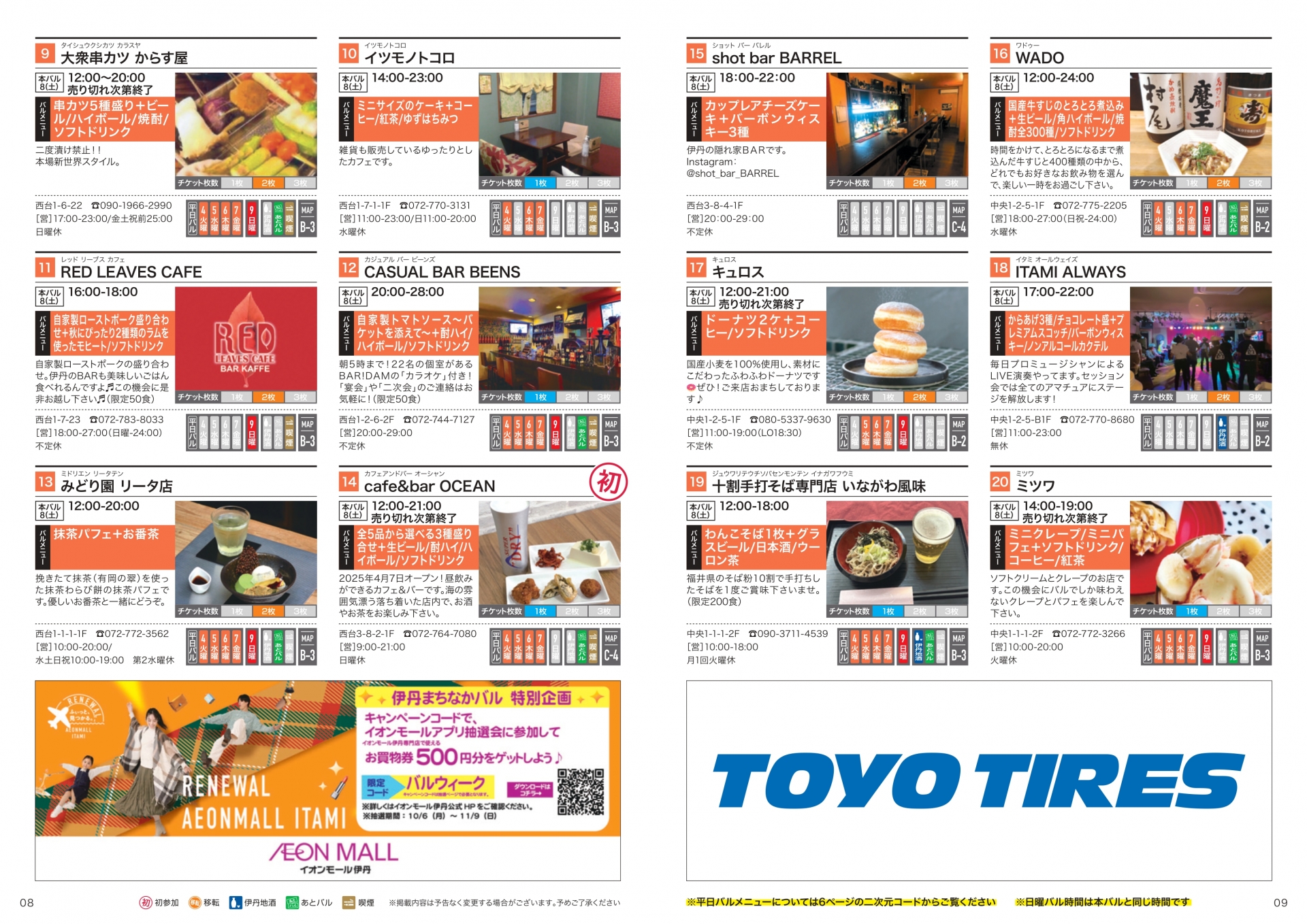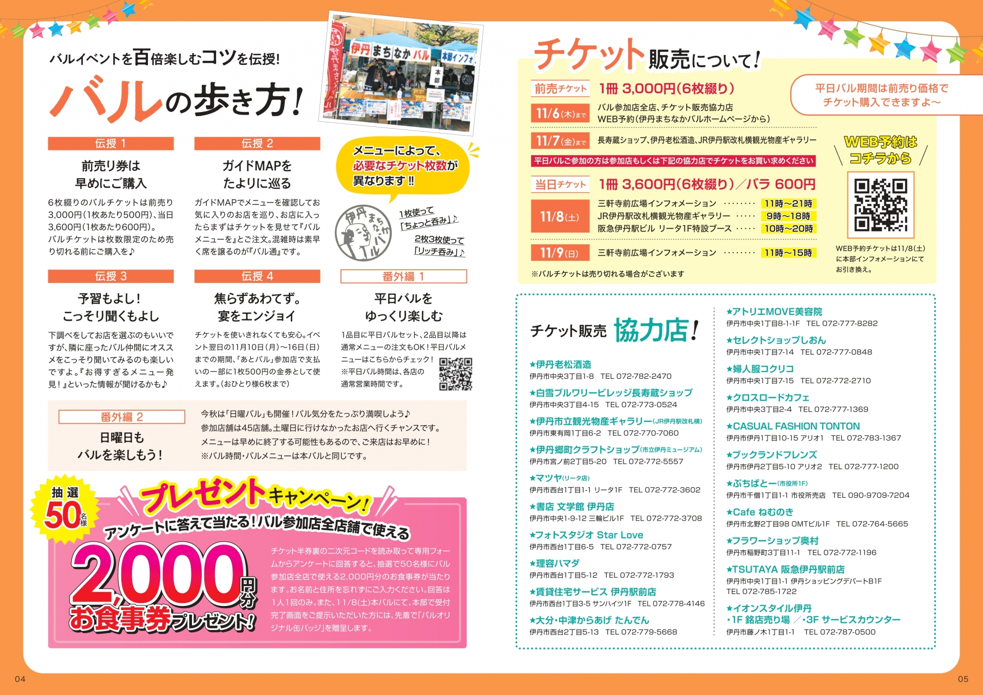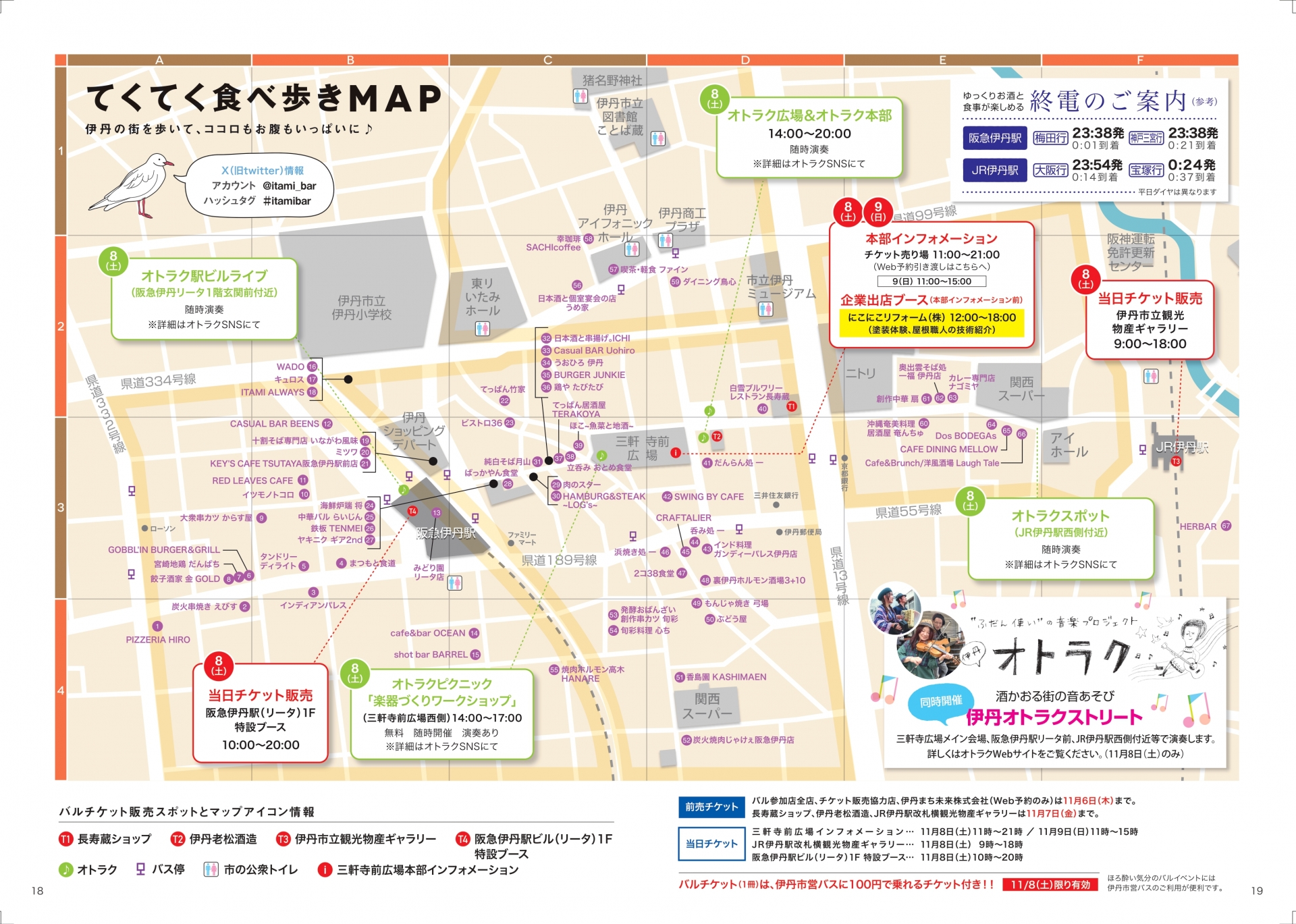 バル参加店全店、チケット販売協力店、伊丹まち未来株式会社(Web予約のみ)は11月6日(木)まで。