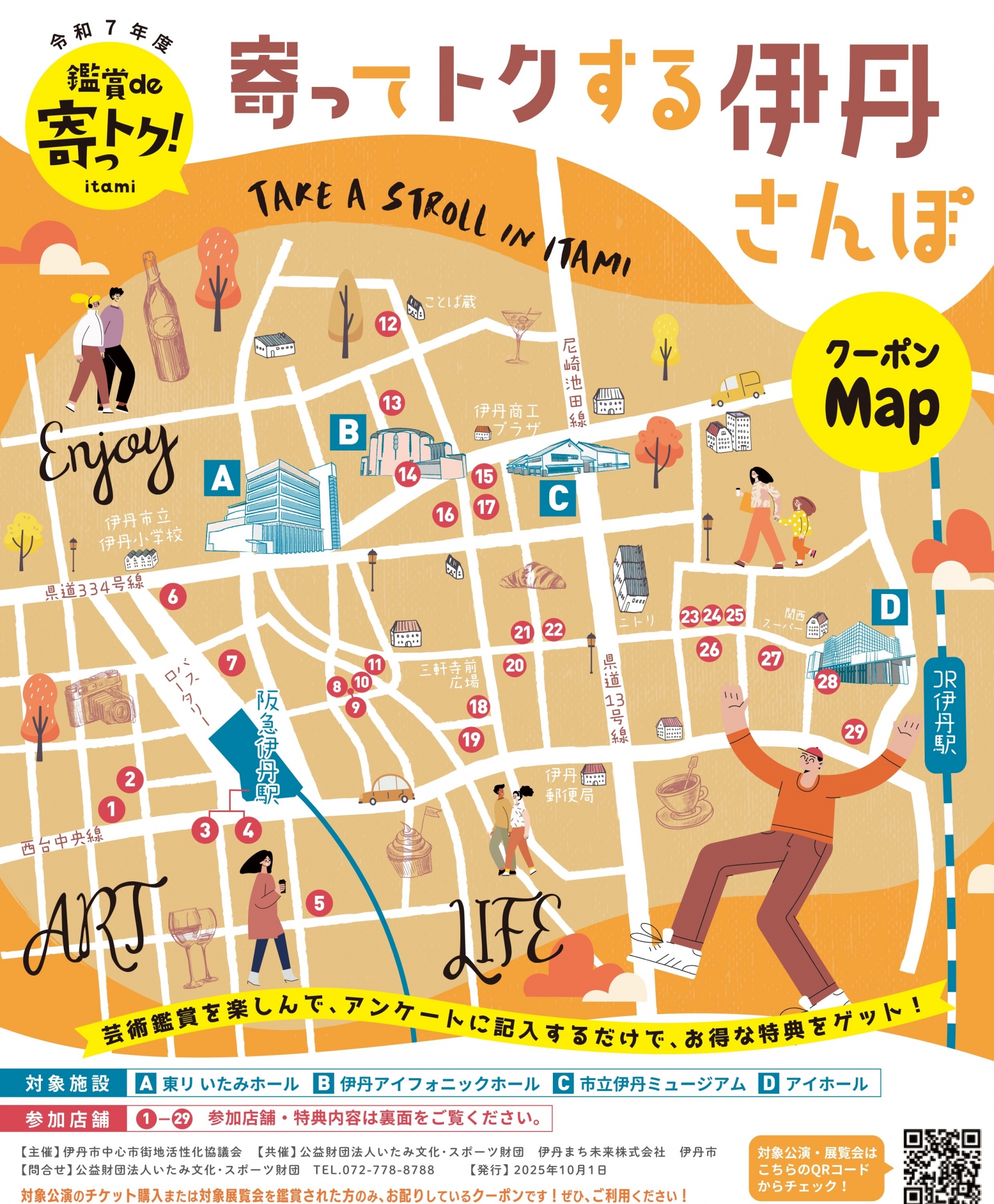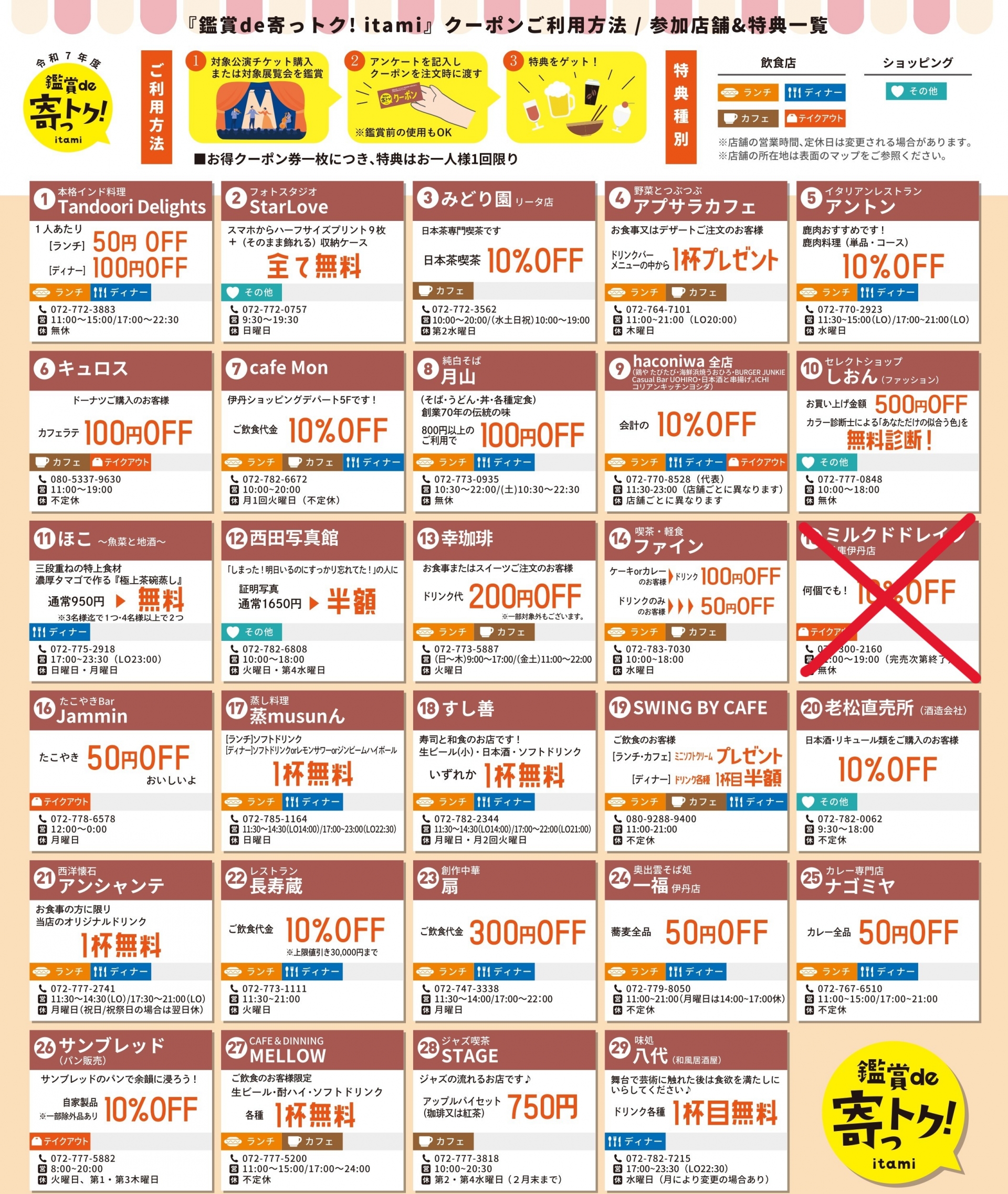 上記施設で行われている「鑑賞de寄っトク!itami」対象公演・展覧会の行き帰りに配布されるチラシの、アンケート付お得券、またはお得券を参加店舗にご提示ください。